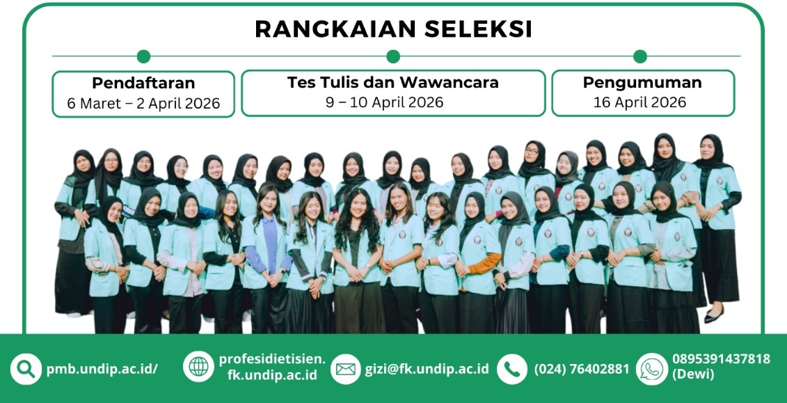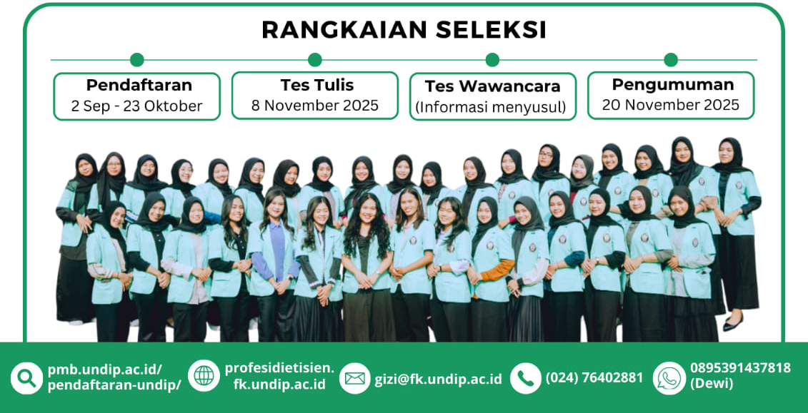 Program Studi Profesi Dietisien, Departemen Ilmu Gizi, Fakultas Kedokteran Universitas Diponegoro kembali membuka kesempatan bagi lulusan Sarjana Gizi untuk melanjutkan pendidikan profesi melalui Program Studi Profesi Dietisien, Fakultas Kedokteran. Pada Semester...